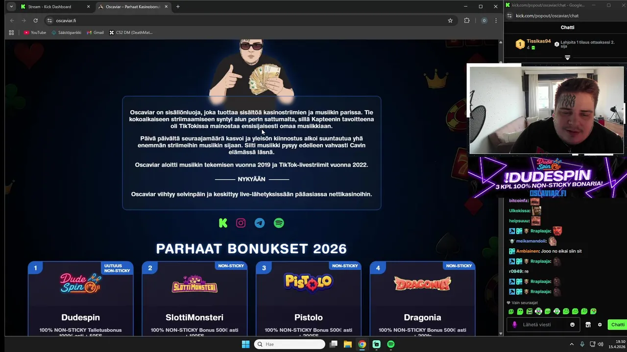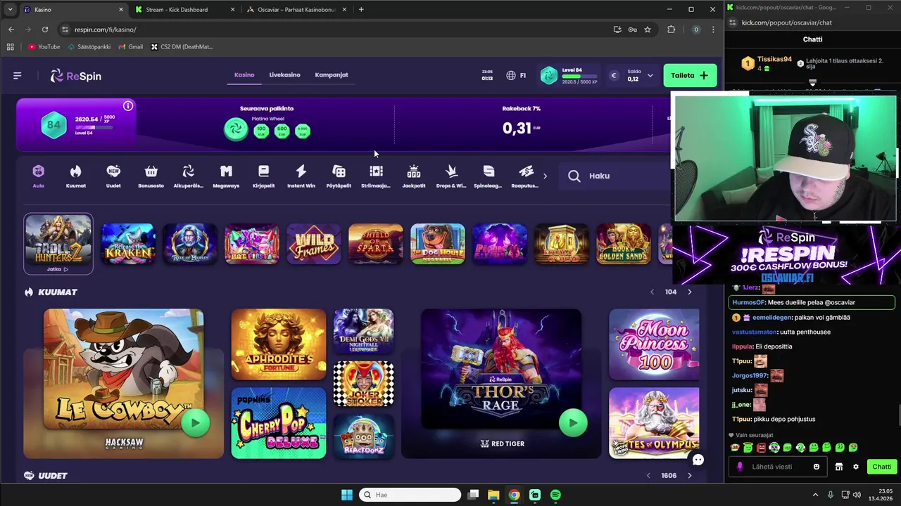 VIIKON EKA KASINOSTRIIMI ➡️ !respin !dudespin !bonus 13.4.2026 21.56 | Slots & Casino | 266.6 | 172 | 274 | 1h 33m | +3 |